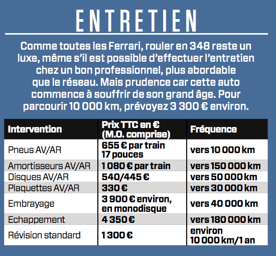 Comme les autos de son époque, la 348 est relativement légère, en restant sous la barre des 1 500 kg. Cela lui permet de ne pas trop faire souffrir les consommables, excepté les pneus arrière, à changer tous les 10 000 km environ. Comptez un budget de 1 080 €, voire plus, car il est conseillé de remplacer en même temps ceux à l’avant, même s’ils sont encore bons !