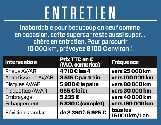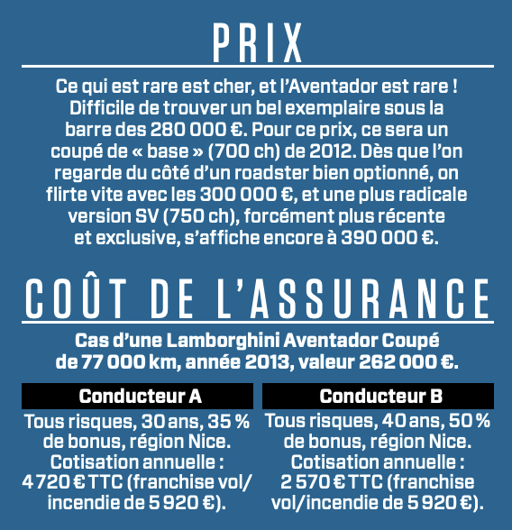 Mais ça y est, c’est la retraite, l’Aventador a terminé sa carrière en 2022 avec l’ultime Ultimae (coupé et roadster) de 780 ch (à partir de 403 495 € en neuf) ! Si vous décidez de prendre le taureau par les cornes, il vous faudra assumer le regard des badauds, et assurer financièrement : comptez aujourd’hui pas moins de 240 000 € pour une LP 700-4.