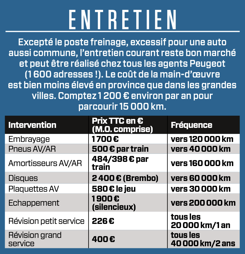 Excepté le poste freinage, excessif pour une auto aussi commune, l’entretien courant reste bon marché et peut être réalisé chez tous les agents Peugeot (1 600 adresses !). Le coût de la main‑d’œuvre est bien moins élevé en province que dans les grandes villes. Comptez 1 200 € environ par an pour parcourir 15 000 km.