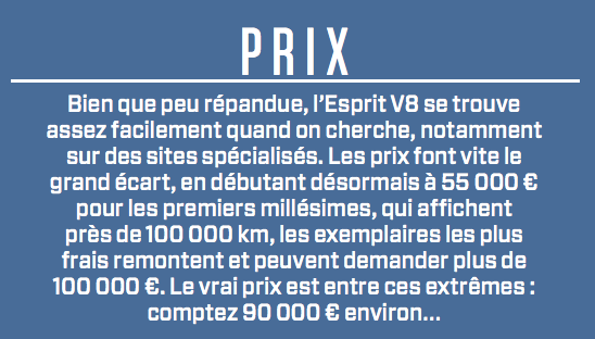 Produite à seulement 1 486 exemplaires de 1996 à 2003, cette ultime Esprit commence à intéresser les amateurs éclairés, comme l’atteste la hausse croissante de sa cote. Comptez désormais au minimum 55 000 € !